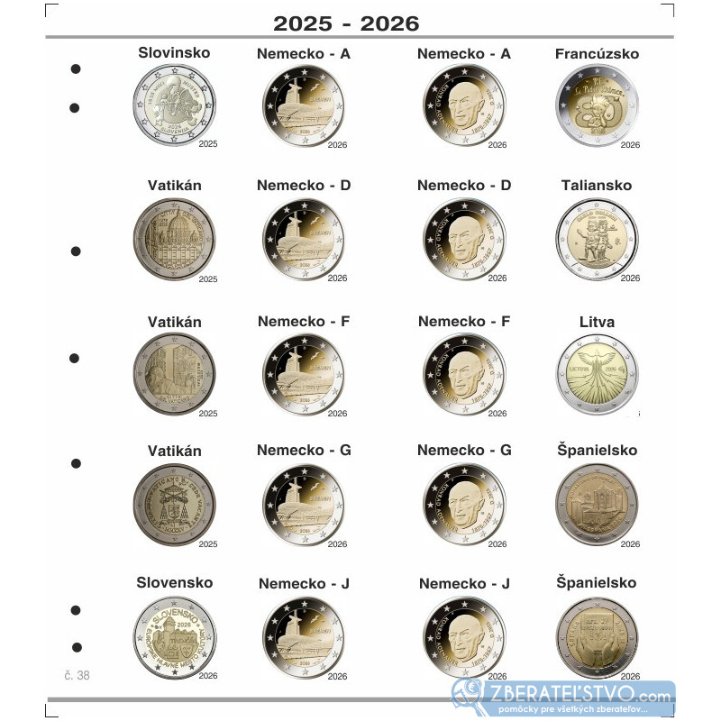 Farebný medzilist do albumov NUMIS na pamätné 2 Euro mince - 20 mincí na stranu - číslo 38 - 2025-2026